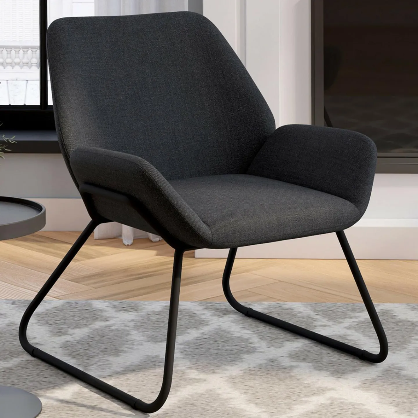 Ce fauteuil design en tissu gris anthracite incarne parfaitement le style moderne avec ses lignes épurées.