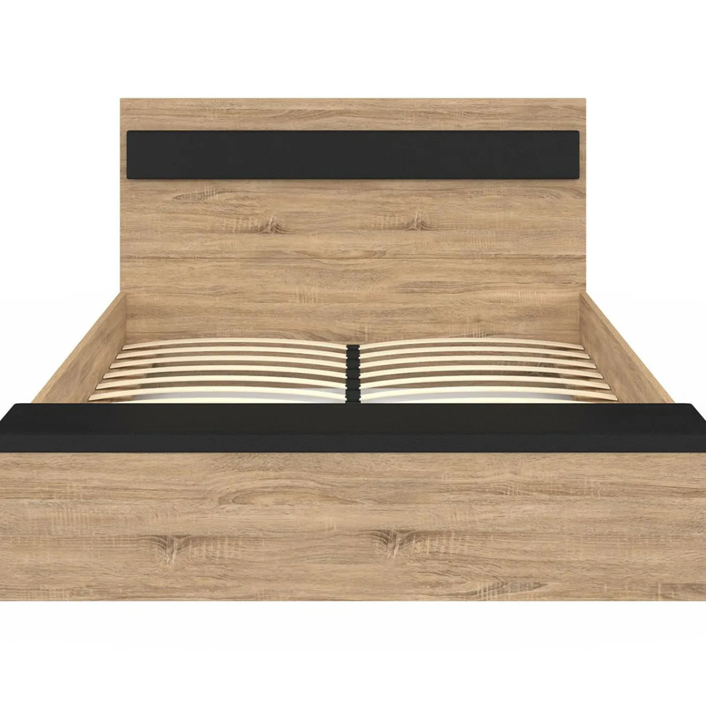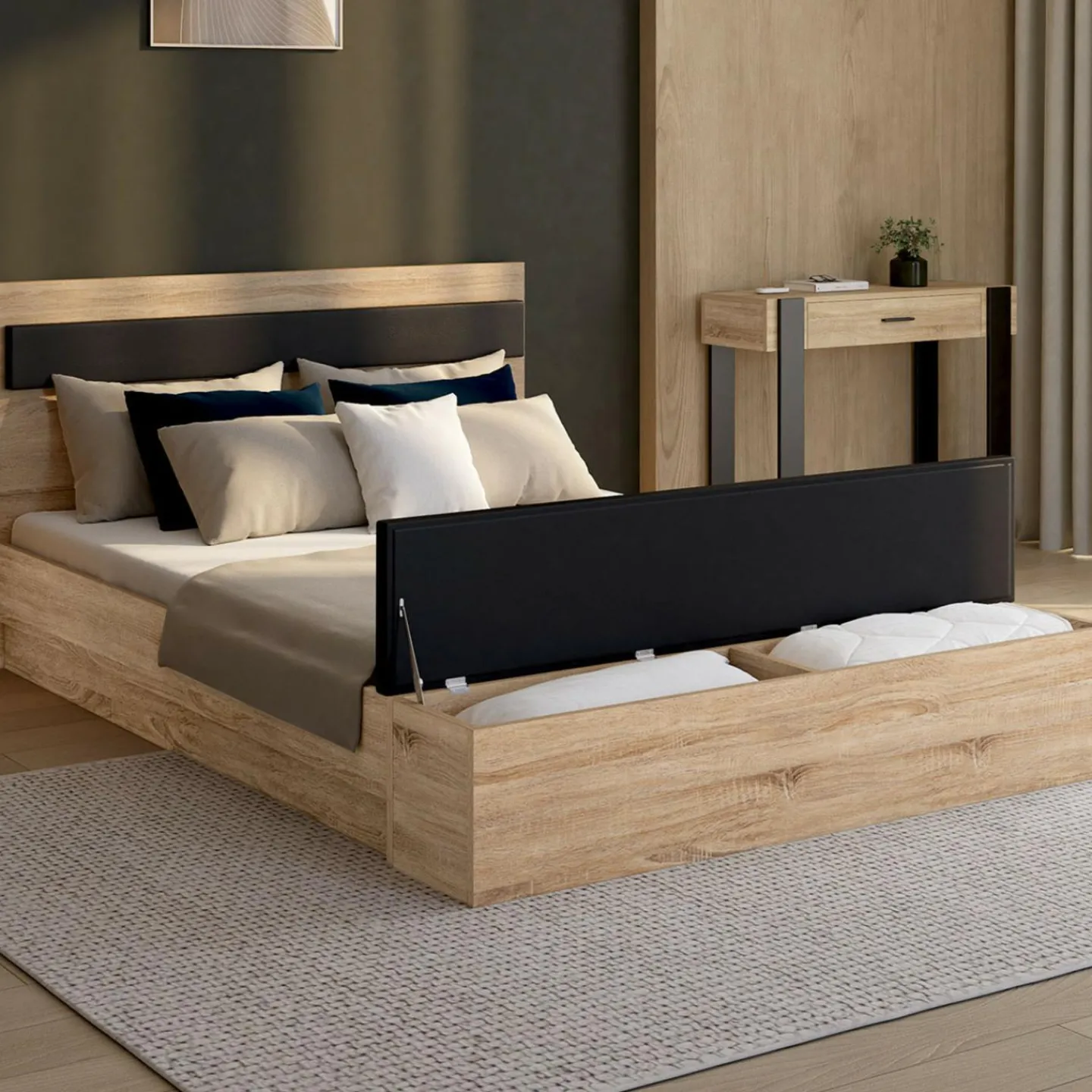 Alliez praticité et design grâce à ce lit double GAELLE 140 x 190 cm avec banc coffre intégré, au coloris bois et noir.