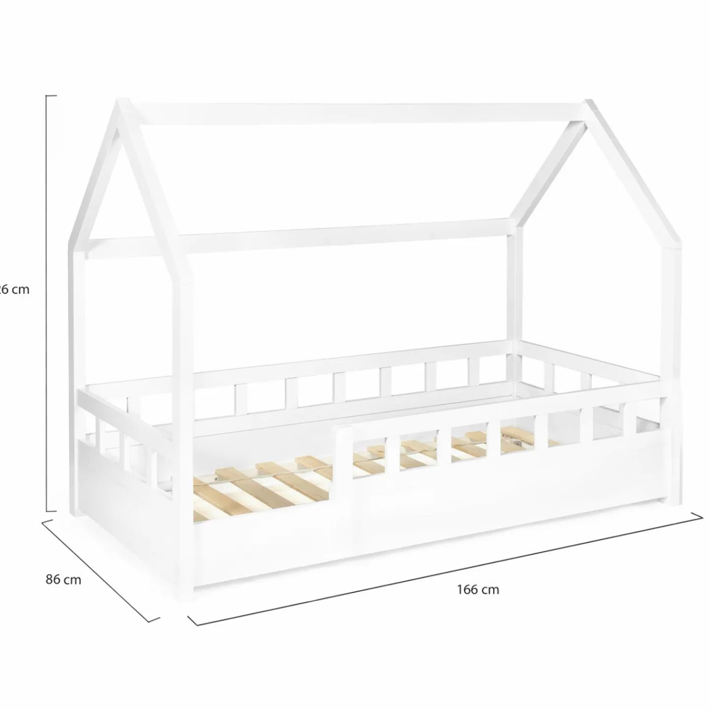 Ce lit enfant cabane blanc est constitué d’un sommier 12 lattes en contreplaqué et d’un cadre en pin. Fixée de part et d’autre du lit, la rambarde en bois offre confort et sécurité à votre enfant.