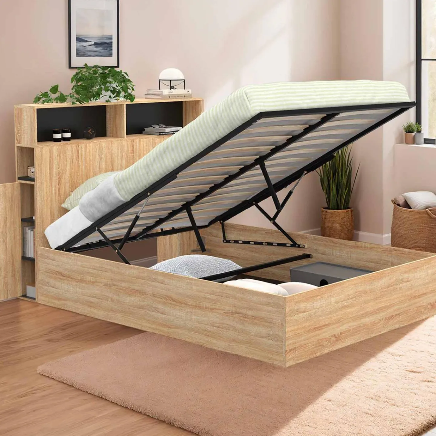 En plus d’avoir des finitions soignées, la structure du lit, pratique et fonctionnelle, abrite sous son sommier un grand coffre de rangement. Vous pourrez facilement y accéder grâce aux vérins de relevage. Celui-ci vous permet d’y entreposer vos valises, votre linge de maison ou tout autre objet afin de conserver un espace nuit ordonné.