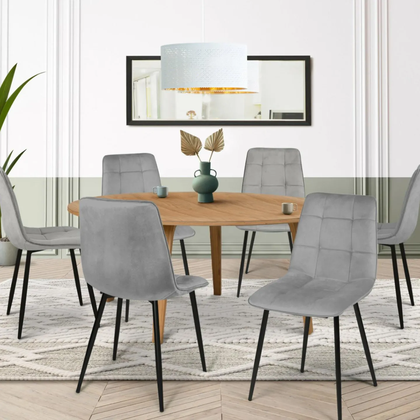 Donnez une note contemporaine à votre cuisine ou à votre salle à manger grâce à ce lot de 6 chaises MILA. Ces chaises en velours gris clair, au design moderne et à l’assise confortable en velours matelassé, transformeront vos repas. Elles trouveront leur place autour d’une table classique ou plus tendance. Un lot de chaises velours gris clair x6 à prix coup de cœur !