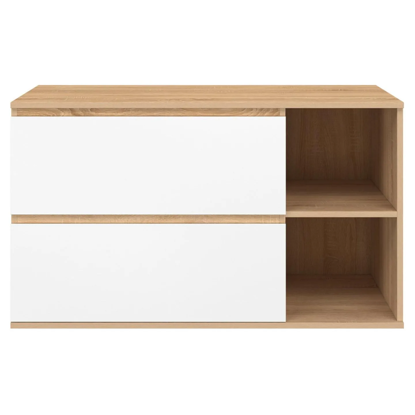Apportez modernité et praticité à votre salle de bain avec ce meuble sous-vasque suspendu au design bicolore hêtre et blanc. Compact et élégant, il offre deux tiroirs spacieux ainsi que deux niches pour une organisation optimale !