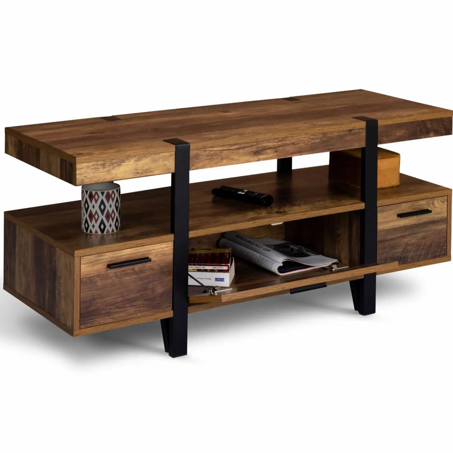 L’association des plateaux effet bois foncé vintage et des pieds en métal noir ajoute un côté loft et factory très tendance à votre déco. Ce meuble TV à pieds épingle, plein de charme avec ses lignes épurées et son style inspiré des ateliers, permet de créer un intérieur authentique et convivial.