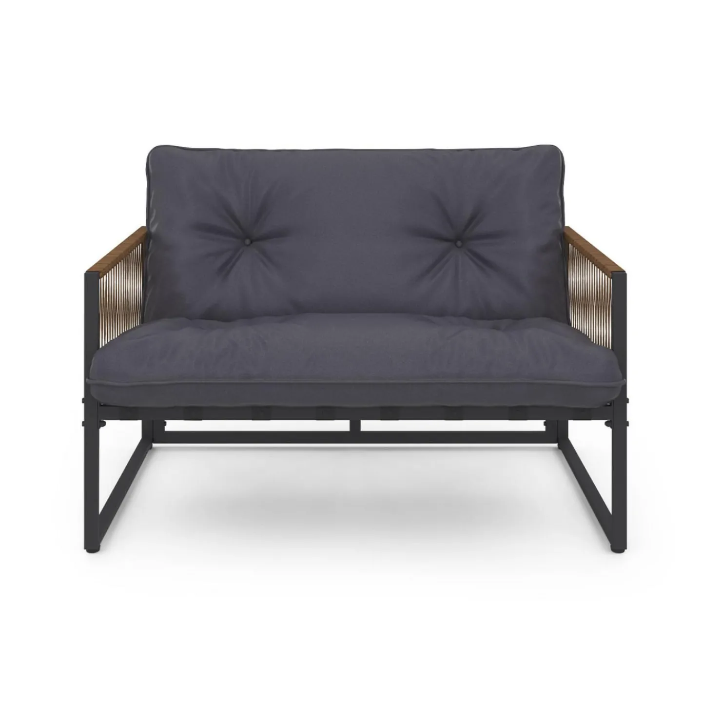 Salon de jardin bas RIO 4 places structure métal gris anthracite, cordage effet rotin avec coussin gris