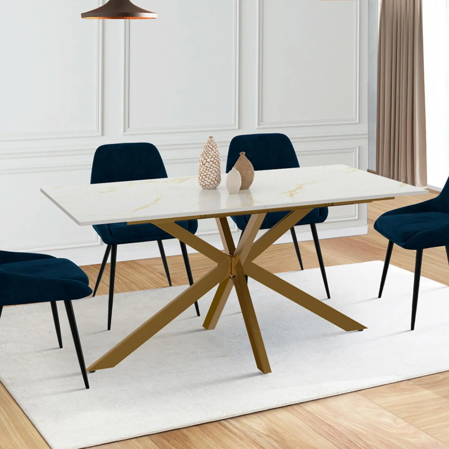 Table à manger extensible rectangle ALIX 6-10 personnes pied araignée laiton plateau effet marbre doré ALASKA 160 – 200 cm
