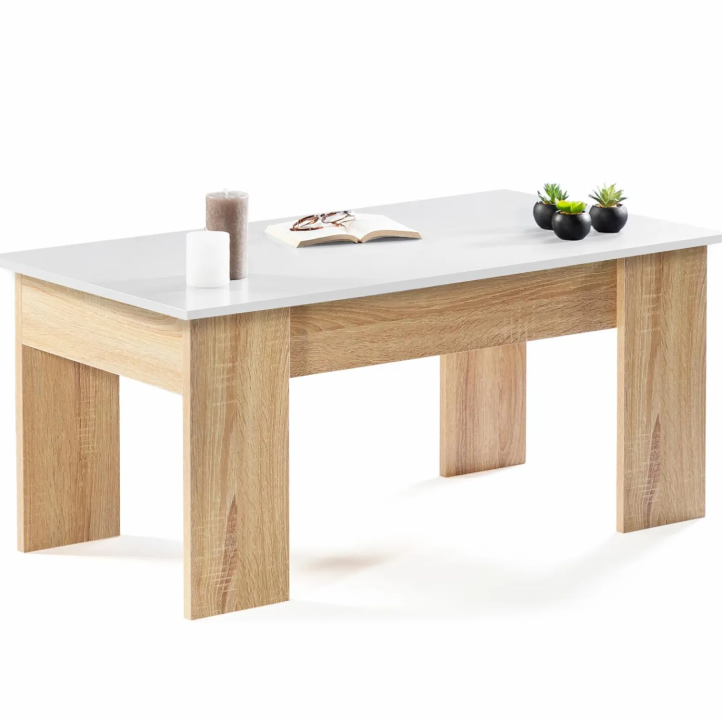 Table basse plateau relevable rectangulaire TARA bois imitation hêtre et blanc