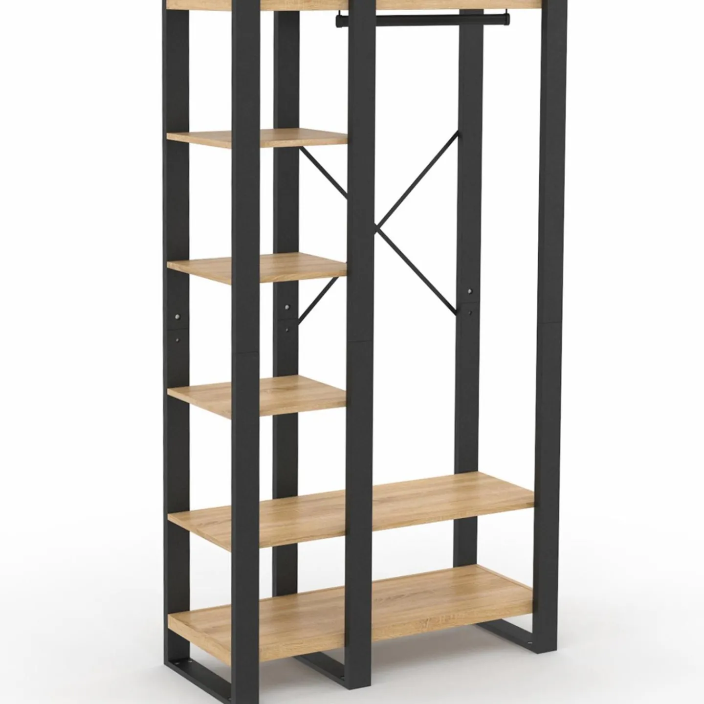 Vous souhaitez relooker votre entrée ? Laissez-vous tenter par la touche industrielle du dressing ONYX ! Grâce à ses 5 étagères et à sa penderie, vous disposerez d’une importante capacité de rangement pour tous vos vêtements. Ce dressing noir et bois style industriel trouvera également sa place dans une chambre ou dans un dressing. Organisez vos accessoires et vêtements à prix tout doux !