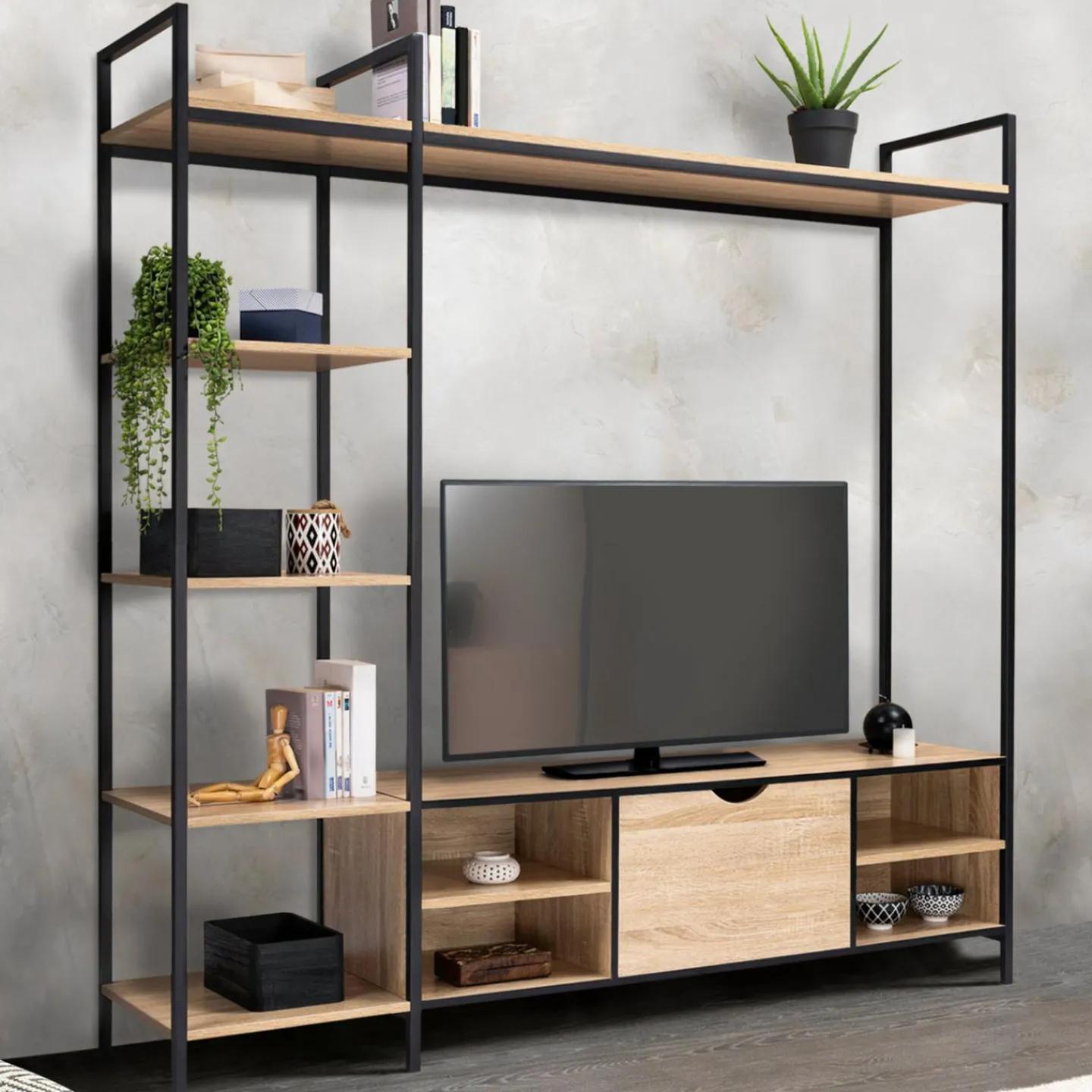 Invitez le style industriel dans votre salon avec cet ensemble meuble TV. À la fois moderne et authentique, ce meuble TV bois et noir s’adapte à tous les styles de déco, le look factory en plus.