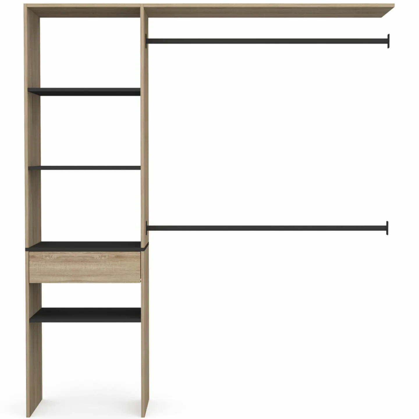 Kit dressing MELINE 160 x 40 x 180 cm hêtre avec étagères noires + tiroir + double penderie