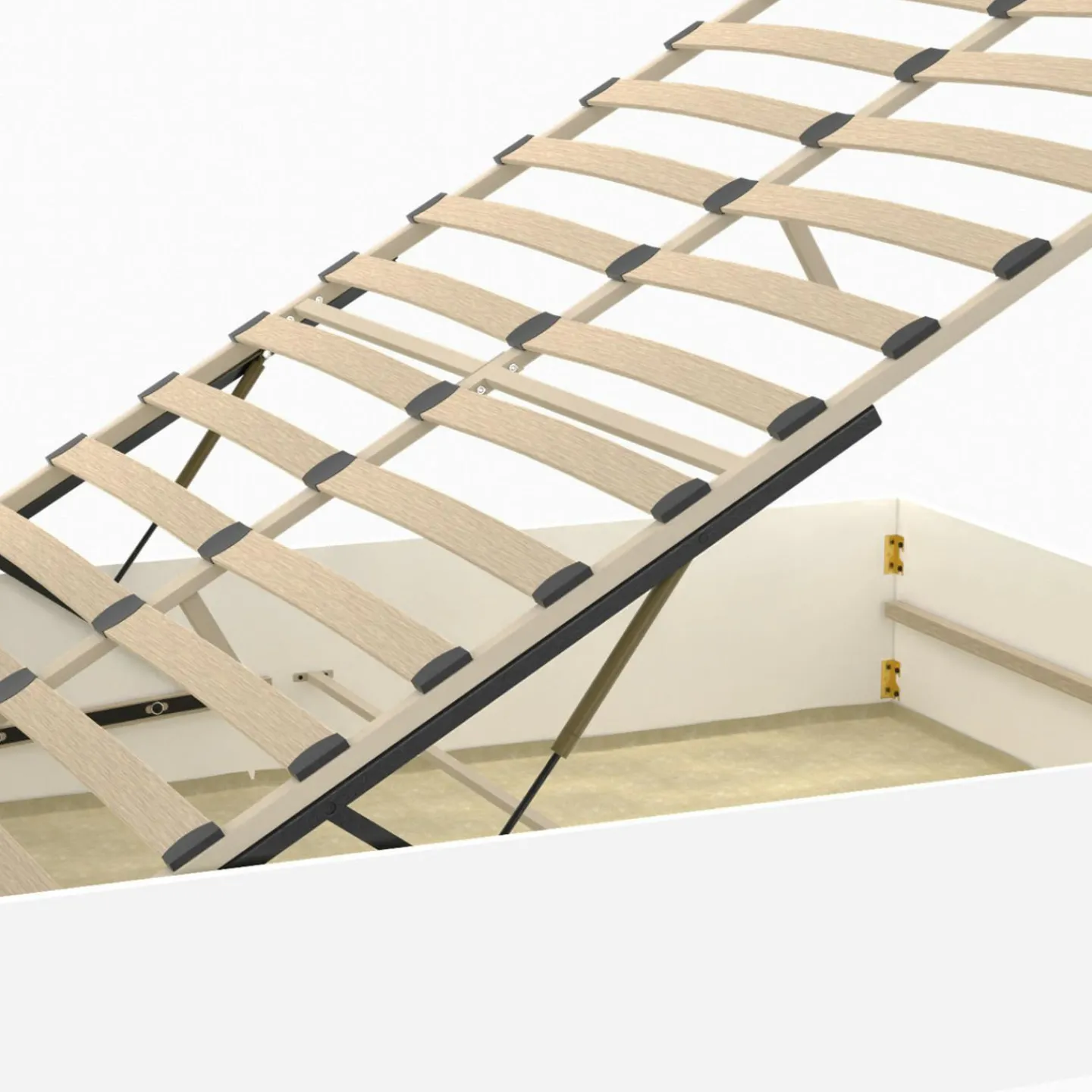 Ce lit coffre pour deux personnes en bois blanc dispose d’un sommier relevable à l’aide de vérins pratiques. Vous accédez ainsi facilement à un vaste espace de rangement, idéal pour profiter d’une pièce toujours ordonnée.