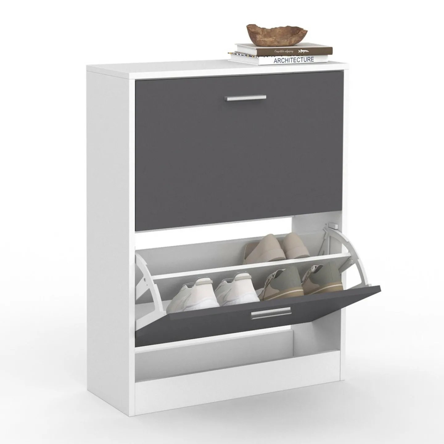 Grâce à ses portes basculantes, vos paires de chaussures sont facilement à portée de main tout en restant discrètement rangées. Les dimensions de ce meuble pas cher permettent de stocker 6 paires de chaussures par espace de rangement, soit 12 paires au total.