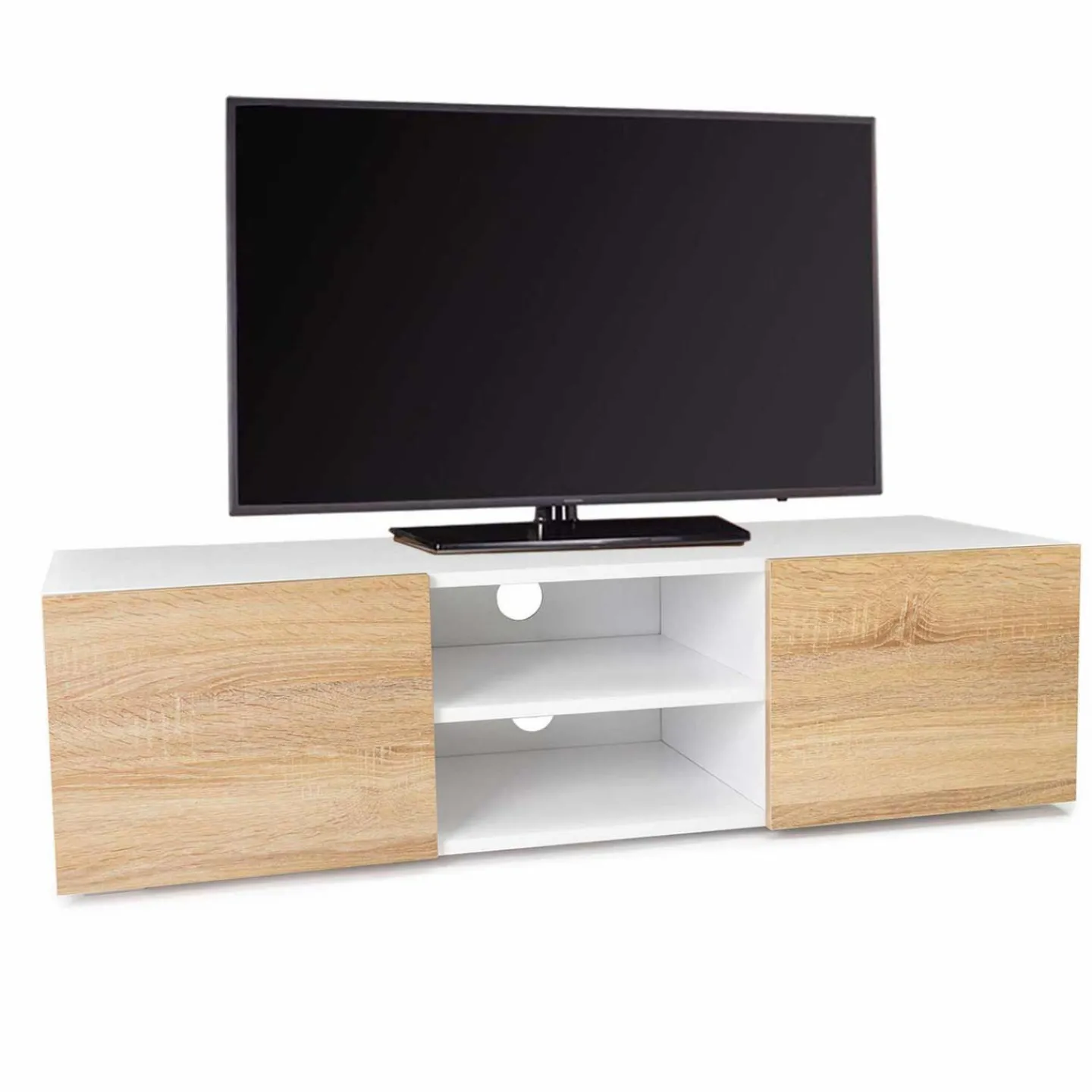Stable et solide, ce meuble TV est fabriqué à partir de panneaux de particules de bois coloris blanc et imitation hêtre d’une épaisseur de 15 mm et sera parfait pour accueillir écran TV, livres, objets de déco, etc.