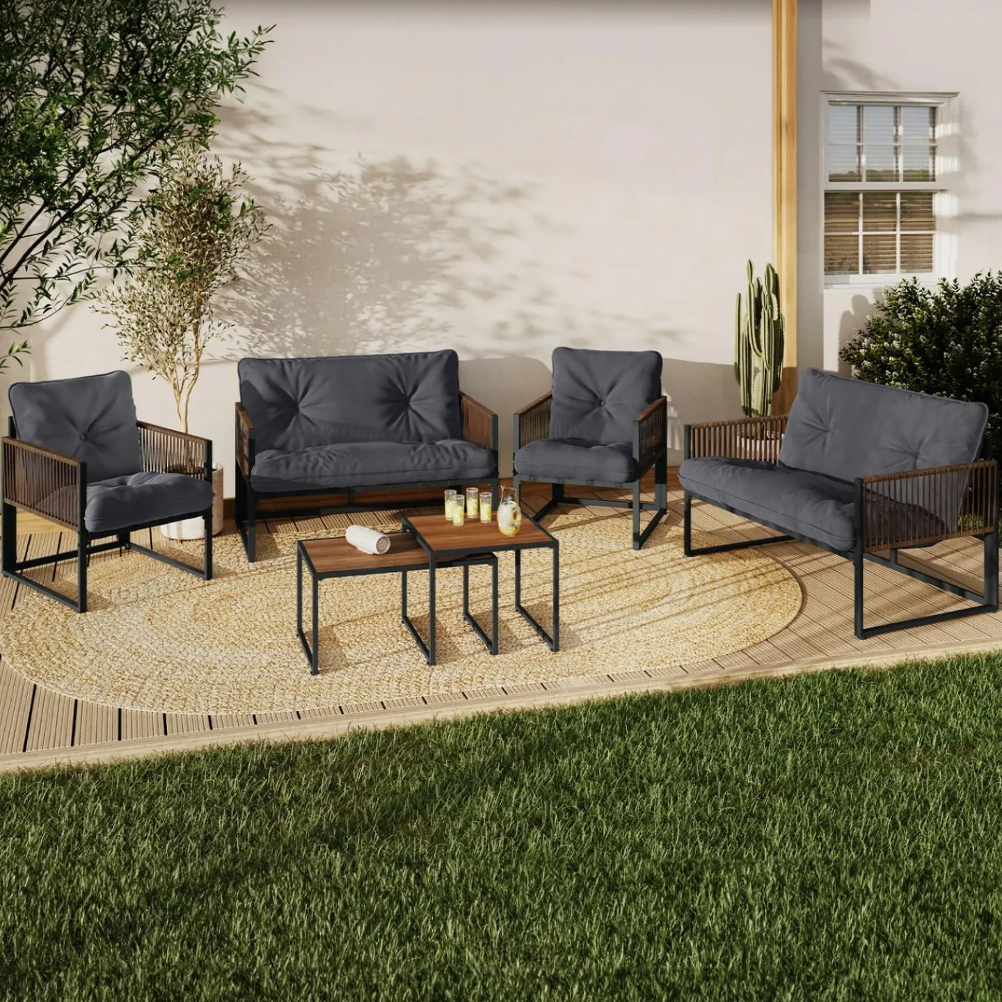 Salon de jardin en acier gris RIO 6 places structure métal et cordage effet rotin avec coussin gris