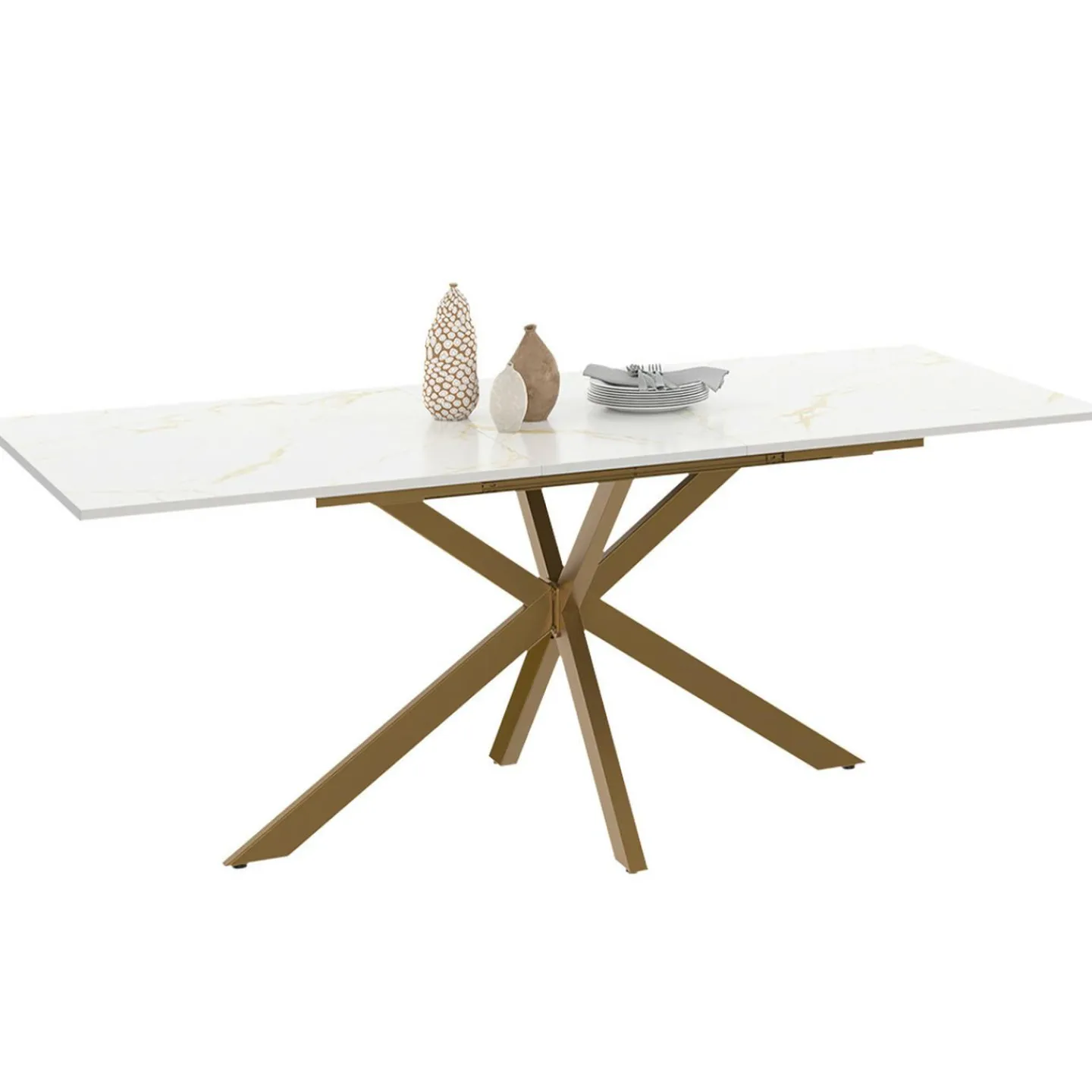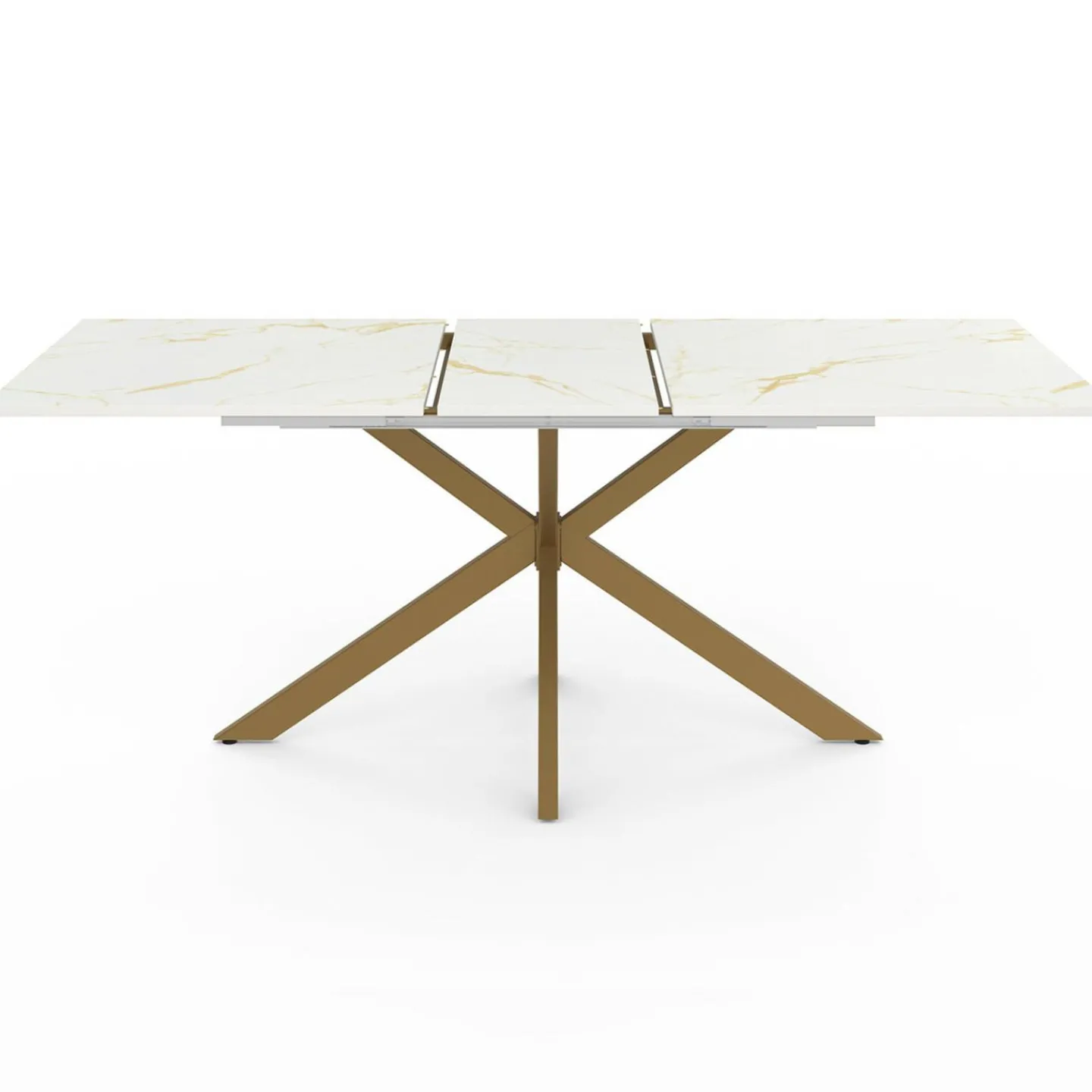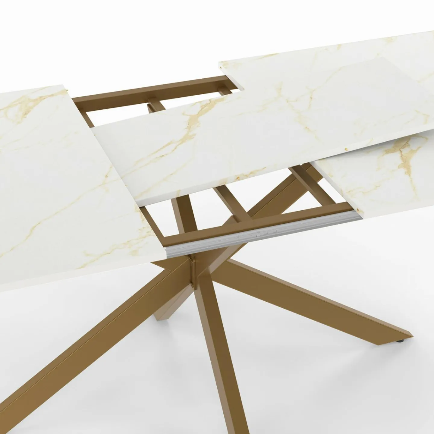 Table à manger extensible rectangle ALIX 6-10 personnes pied araignée laiton plateau effet marbre doré ALASKA 160 – 200 cm