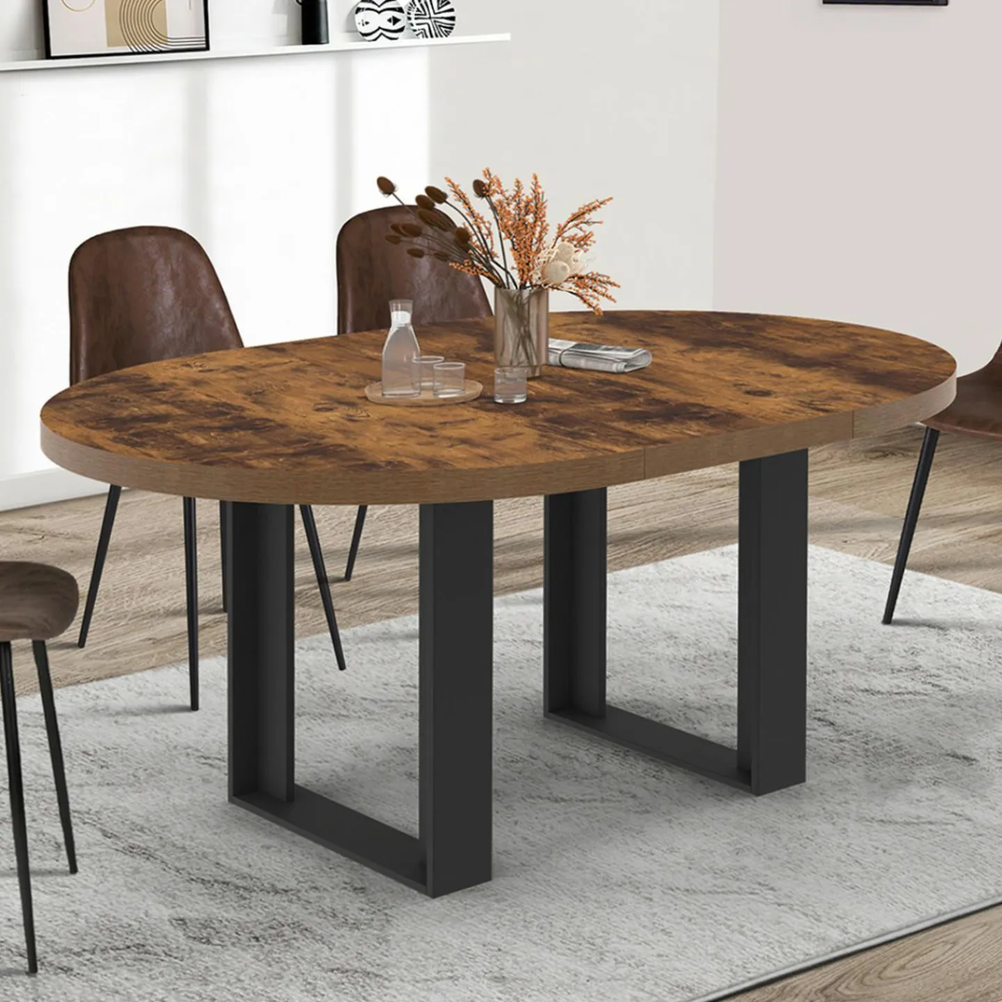 Cette table à l’aspect massif aux lignes épurées sera la pièce maîtresse de votre salle à manger. Sa forme arrondie lui apporte finesse et élégance. Son style lui donne un aspect industriel qui s’adapte parfaitement aux univers classiques et contemporains. La combinaison des coloris bois vieilli et noir apportera une touche sophistiquée à votre intérieur !