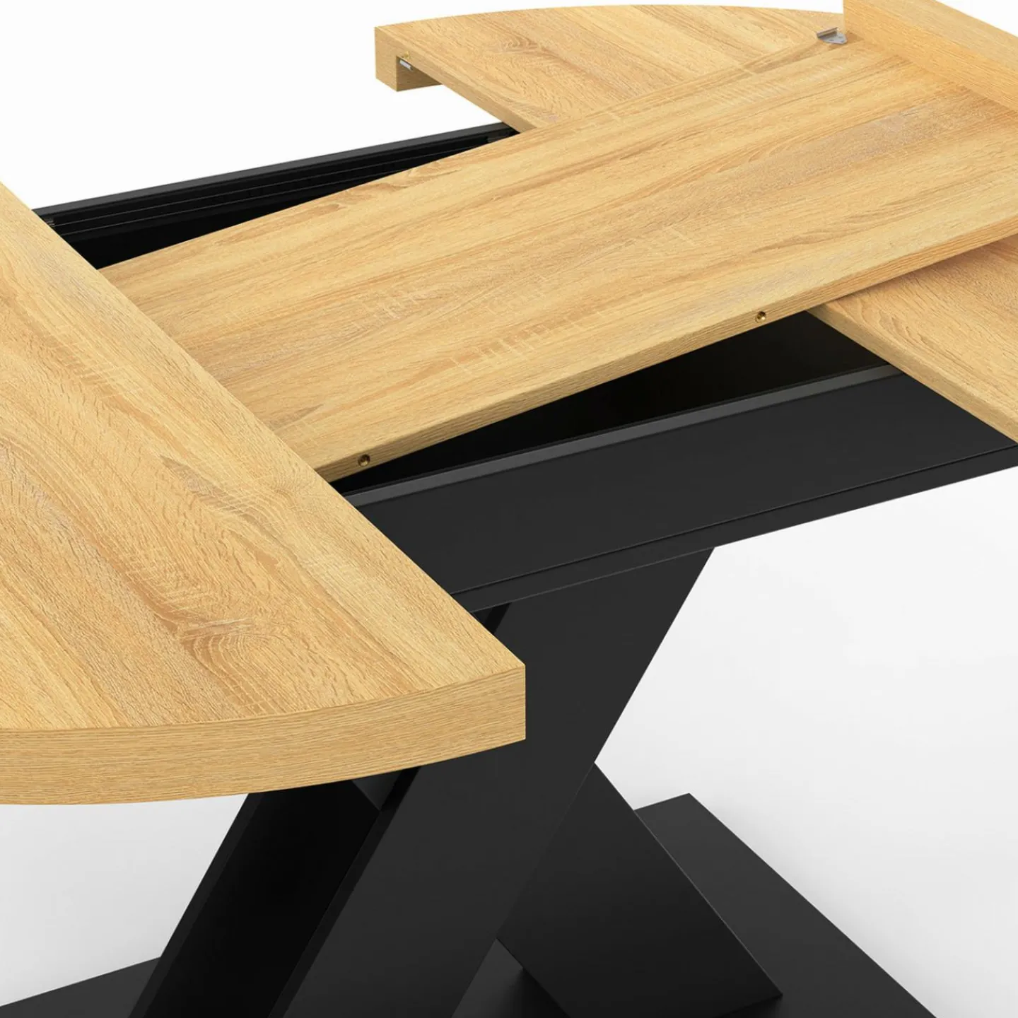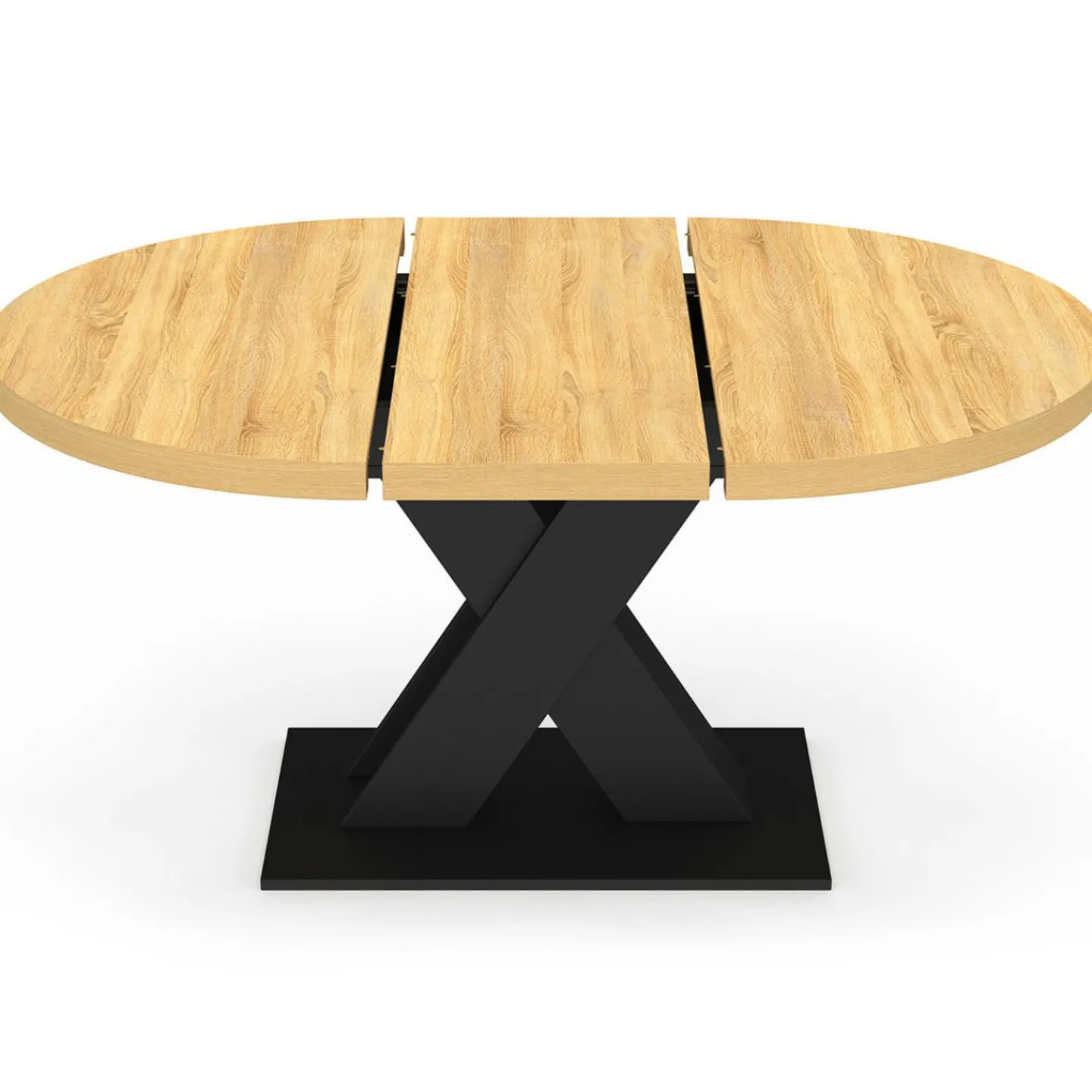 Apportez une touche de modernité et de convivialité à votre maison avec notre table à manger ALICIA bois et noir 110-150 cm. Conçue pour apporter style et praticité à votre salle à manger, cette table se distingue par son pied en forme de X et son plateau rond effet bois qui lui confère un design unique.