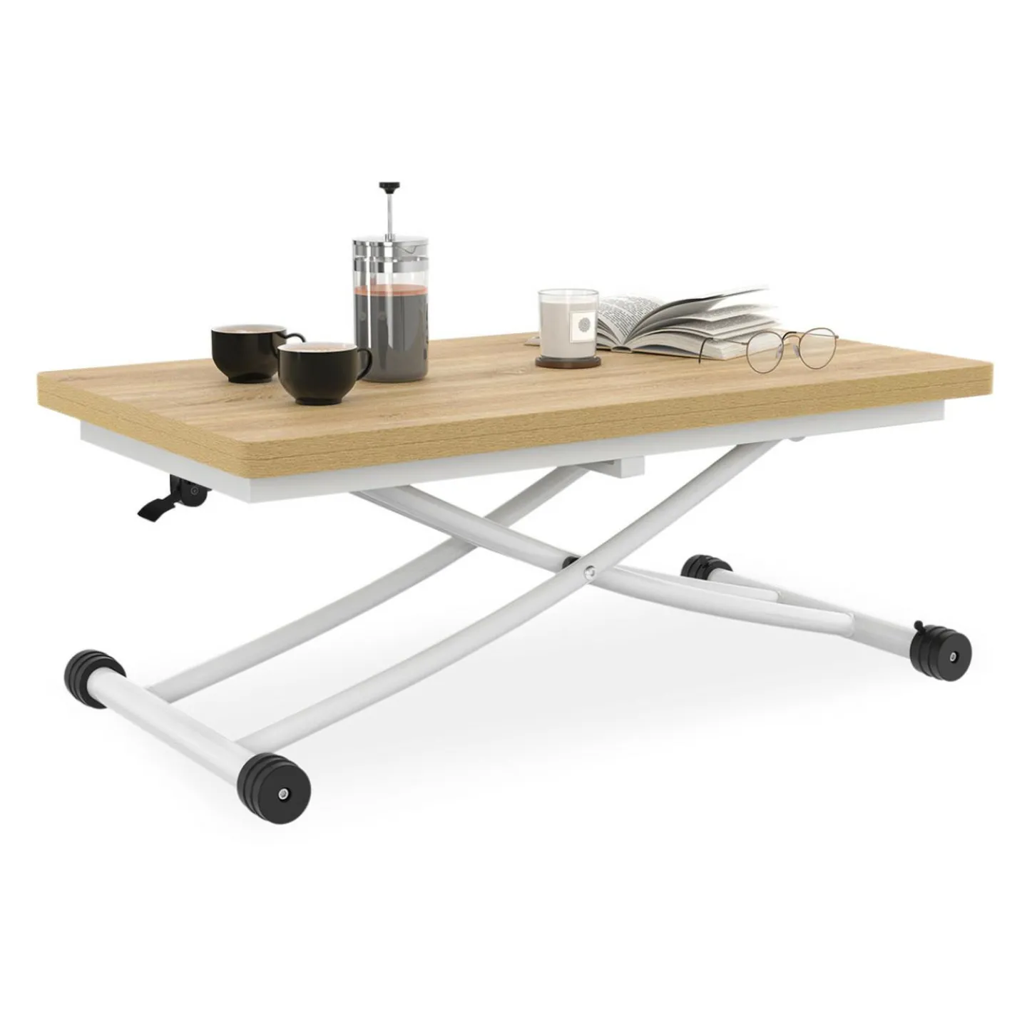 Sublimez votre intérieur avec la table basse relevable plateau portefeuille bois façon hêtre et pieds blancs à petit prix !