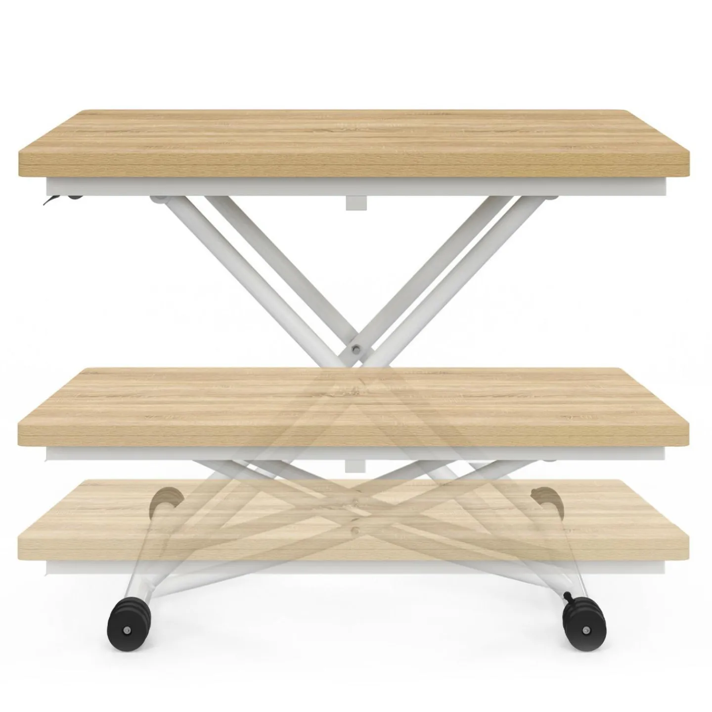 Table basse extensible relevable en table à manger rectangulaire URBANA 100 cm plateau façon hêtre pied blanc