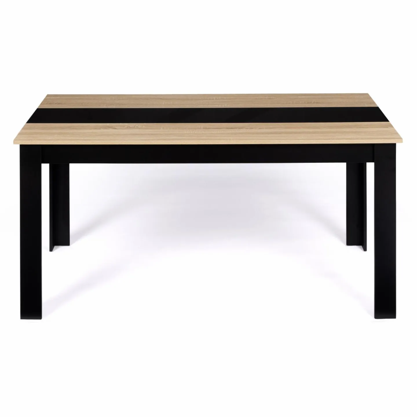 Le plateau de cette table de cuisine 8 personnes est composé de 2 coloris, imitation hêtre et noir, pour un aspect encore plus moderne. La ligne centrale en MDF noire avec finition laquée lui donne une note tendance. Ses dimensions compactes, 160 x 75 cm, vous permettront de recevoir confortablement jusqu’à 8 invités, sans pour autant occuper trop de place dans votre salle à manger.