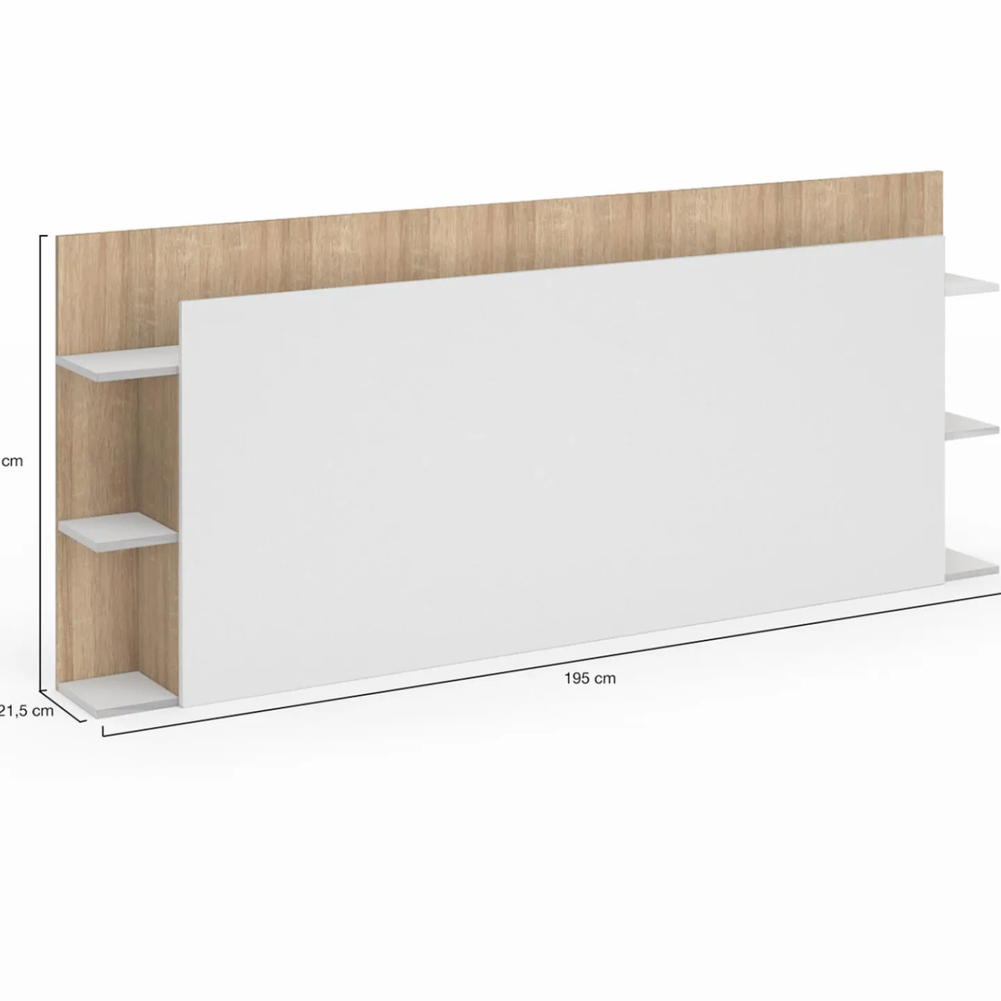 Ajoutez une touche tendance et pratique à votre espace de nuit grâce à la tête de lit avec étagères CIRI blanc et bois, où fonctionnalité rime avec élégance ! Profitez de multiples espaces de rangement pour garder votre chambre ordonnée : une grande étagère au-dessus et 4 niches latérales vous permettent d’y disposer livres et objets personnels.