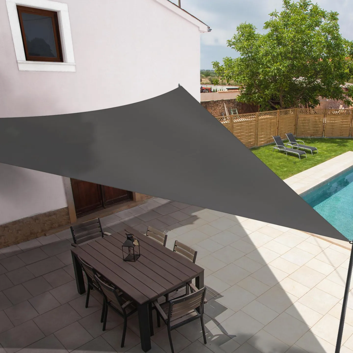 La toile ombrage triangulaire grise, une solution pas chère et efficace pour un espace ombragé en quelques minutes.